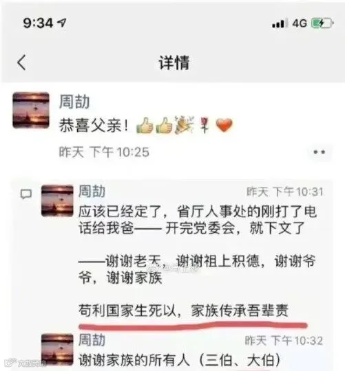 近日,一个微信名为“周劼”的朋友圈截图引发公众关注。相关截图显示,周劼多次发朋友圈炫耀自己的关系背景以及财富。包括“和单位的一把手吃饭”“父亲的副局长没问题了”“胡副省长给了我一根烟”……以及“比我妈给我买10套房还激动”“20万一斤的白毫银针”等等。