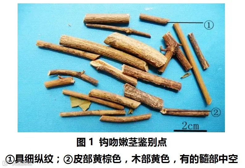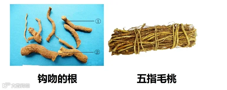 钩吻的根表面是棕黄色,有明显的纵纹,弯曲处会露出木心,并可块片状剥离;而五指毛桃的根表面一般是红棕色栓皮,纤维性强,能成片撕下。