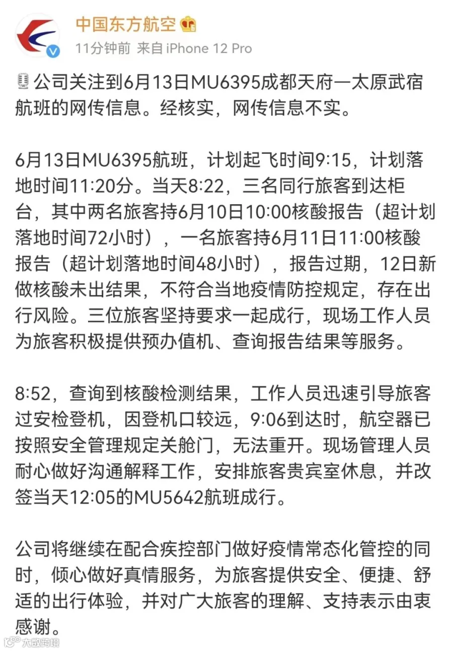 16日,中国东方航空官方微博发布回应称,公司关注到6月13日MU6395成都天府—太原武宿航班的网传信息。经核实,网传信息不实。详情如下: