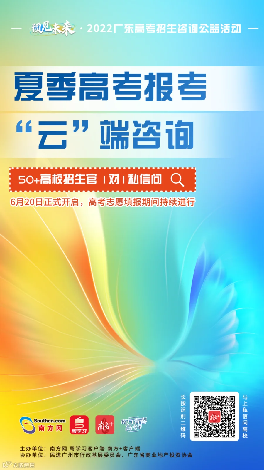 6月20日起,由南方网、粤学习客户端、南方+客户端主办的“预见未来·2022年广东高考招生线上咨询周”,将在广东阳光招考掌上平台举办,志愿填报期间持续进行。