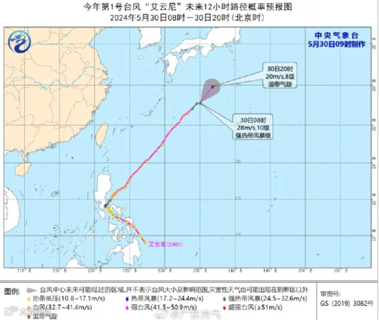 30日08时,今年第1号台风“艾云尼”中心位于琉球群岛那霸市东偏北方向约740公里的西北太平洋洋面上,中心附近最大风力有10级(28米/秒)。预计,“艾云尼”将以每小时20-25公里的速度继续向东北方向移动,强度逐渐减弱。