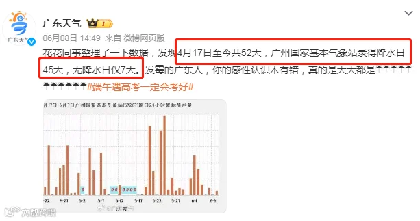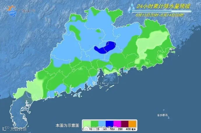 14日,粤西北、珠江三角洲北部市县有大雨到暴雨局部大暴雨,广东南部市县有中到大雨局部大暴雨,其余市县多云到阴天,有(雷)阵雨局部暴雨。广东最高气温:雷州半岛市县33℃~35℃,其余大部市县介于29℃~33℃之间。