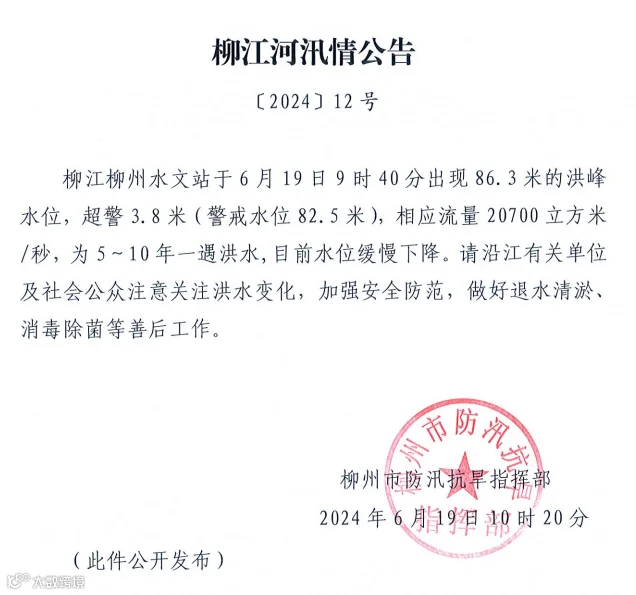 柳江现5年~10年一遇洪水