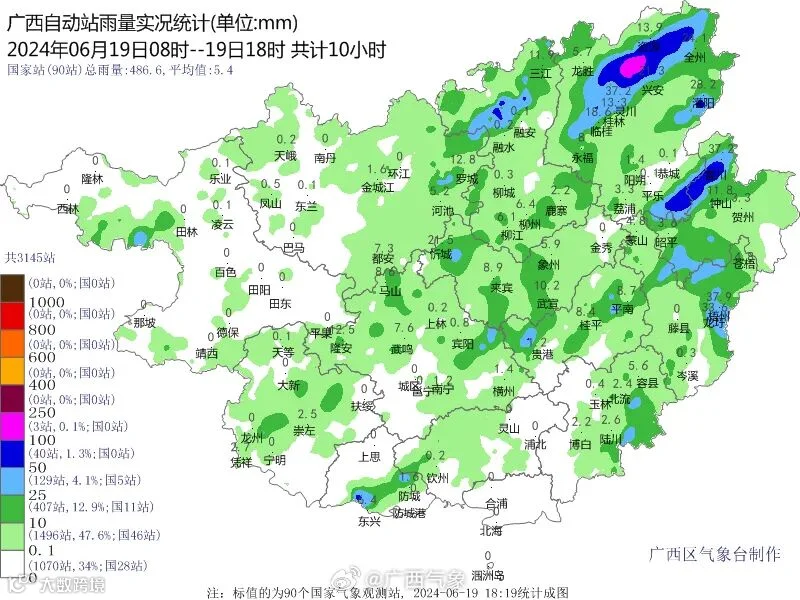 前期桂林等地的雨有多猛?@广西气象 统计显示,6月12日20时以来,桂林、柳州、河池、贺州、来宾、南宁、百色、崇左等地出现暴雨到大暴雨、局地特大暴雨天气,截至19日8时,桂林市兴安县的2个乡镇超过800毫米(溶江镇843.8毫米、兴安镇831.4毫米),600~800毫米的有桂林市的3个县(市、区)的6个乡镇。