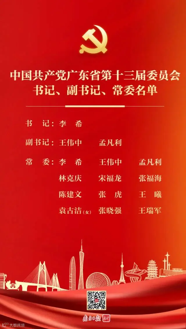 全会选出中国共产党广东省第十三届委员会常务委员会委员和书记、副书记,李希、王伟中、孟凡利、林克庆、宋福龙、张福海、陈建文、张虎、王曦、袁古洁、张晓强、王瑞军当选为省委常委,李希当选为省委书记,王伟中、孟凡利当选为省委副书记。