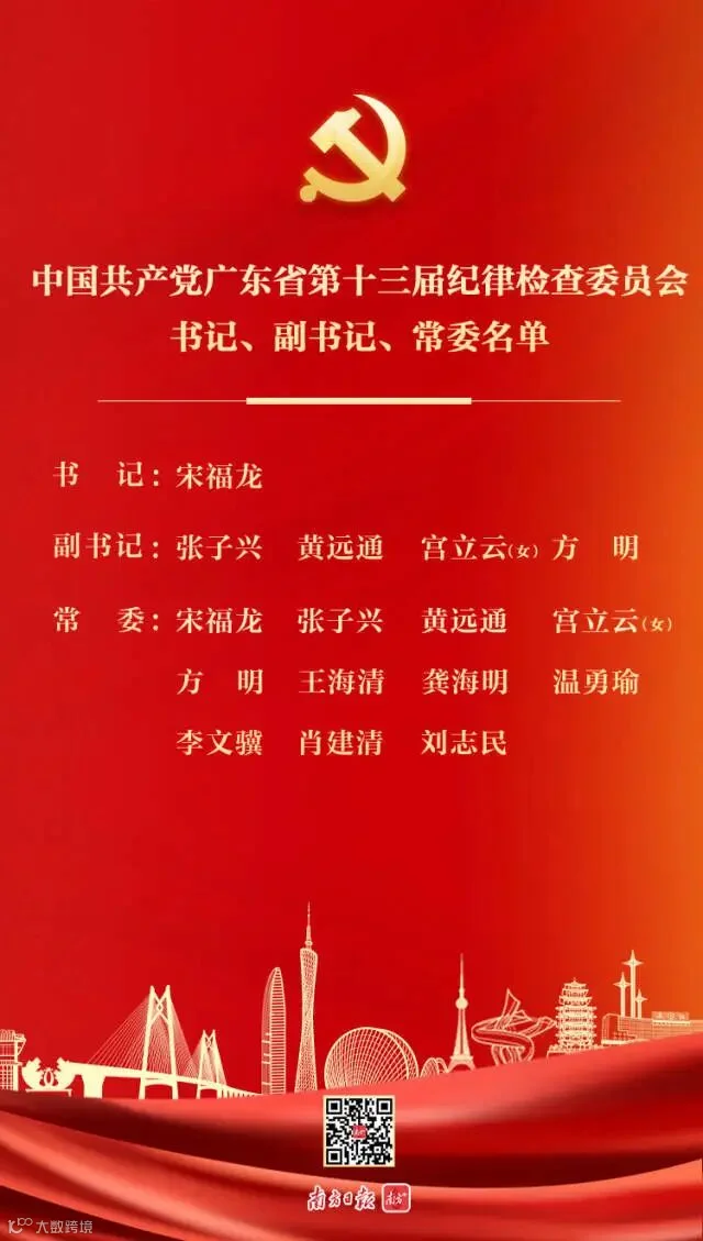 中国共产党广东省第十三届纪律检查委员会书记、副书记、常委名单