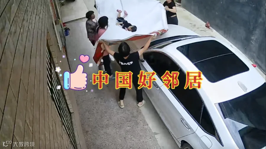 一起用蓬布将坠落女童安全接住