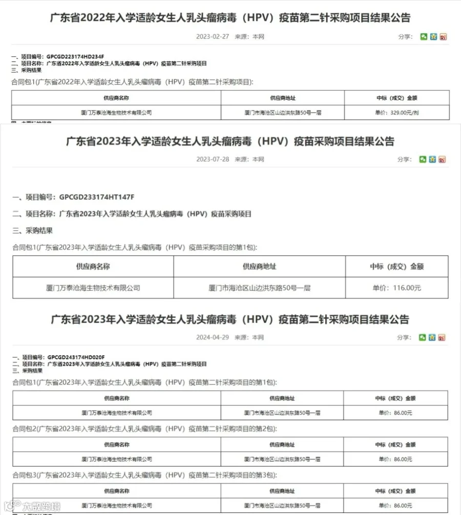 4月底,广东省政府采购中心公布2023年入学适龄女生人乳头瘤病毒(HPV)疫苗第二针采购项目结果,万泰生物的二价HPV疫苗以86元的单价中标,而前两次公布同款疫苗的中标价格分别是329元、116元。