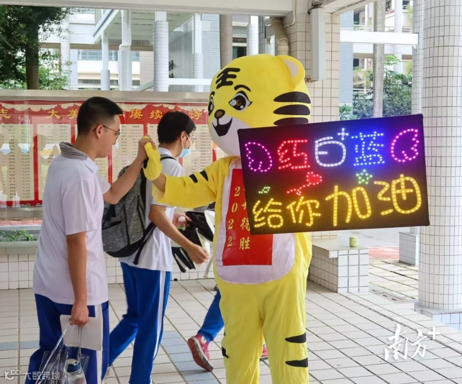 在广东肇庆中学考点,老师们穿上红色衣服或旗袍,在考生进考场前与大家击掌打气。一位老师变装“老虎超人”,举着灯牌为考生打call。