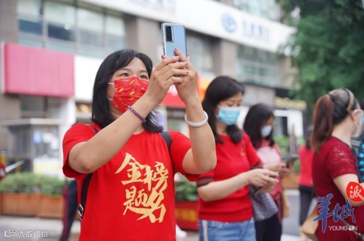 广州天河中学(珠江新城高中部)门口,家长和老师组成的“拉拉队”正在为考生加油打气。