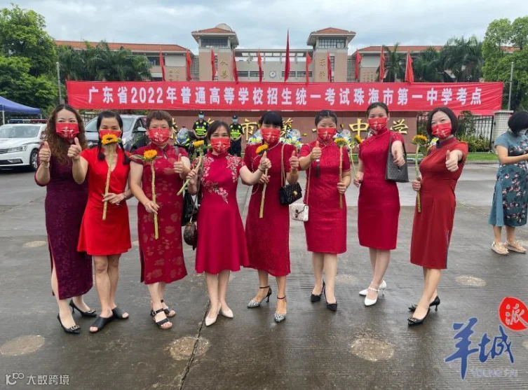 珠海一中考点门口,吴小姐(右一)和她的朋友们特意穿上红旗袍,手持向日葵,希望孩子们一举夺魁。