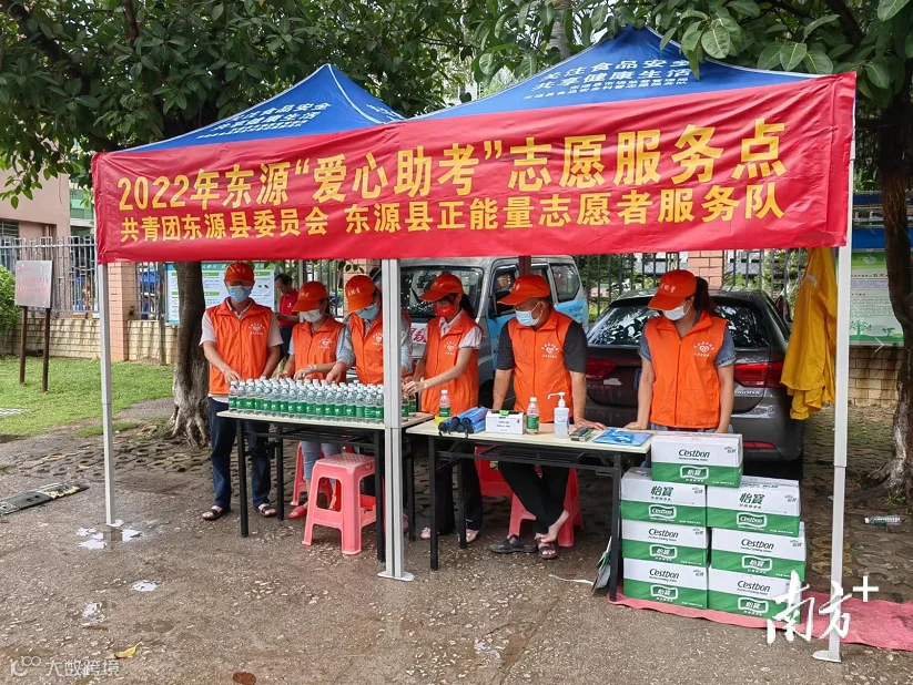 在河源市东源中学考点,共青团东源县委东源县正能量志愿者服务队自2016年起,连续六年在该考场设服务点,为有需要的考生提供提供草稿纸、考试笔、饮用水、消毒液、口罩、雨伞等物品,同时为遇到应急情况的考生提供帮助。
