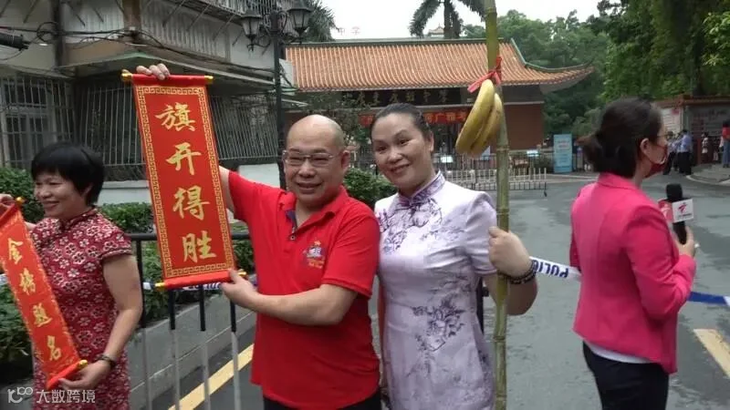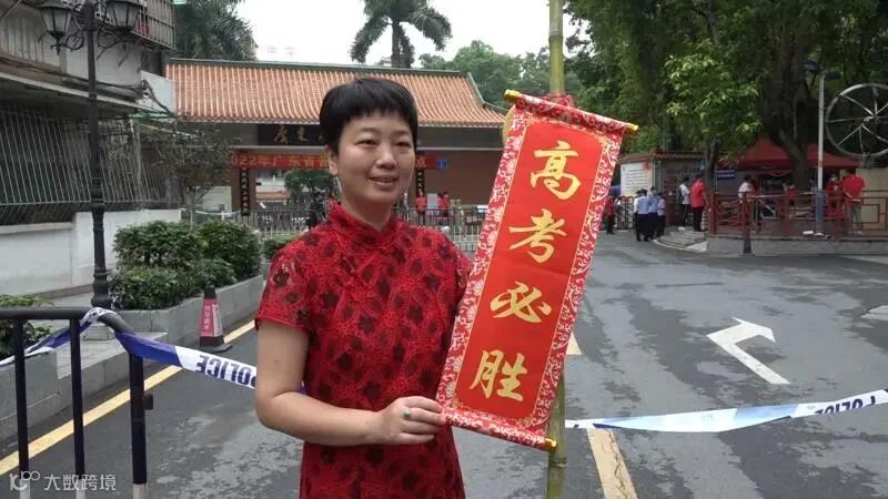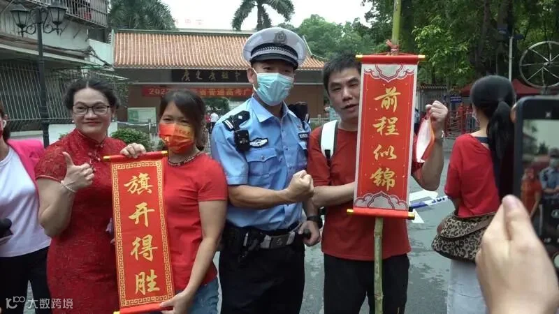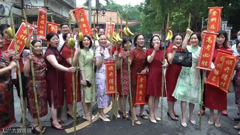 广州市广雅中学考点门口,考生家长们身穿艳丽旗袍,手拿甘蔗、香蕉和红色卷轴,齐喊“旗开得胜,掂过碌蔗”口号,为考生送去鼓励和祝福。