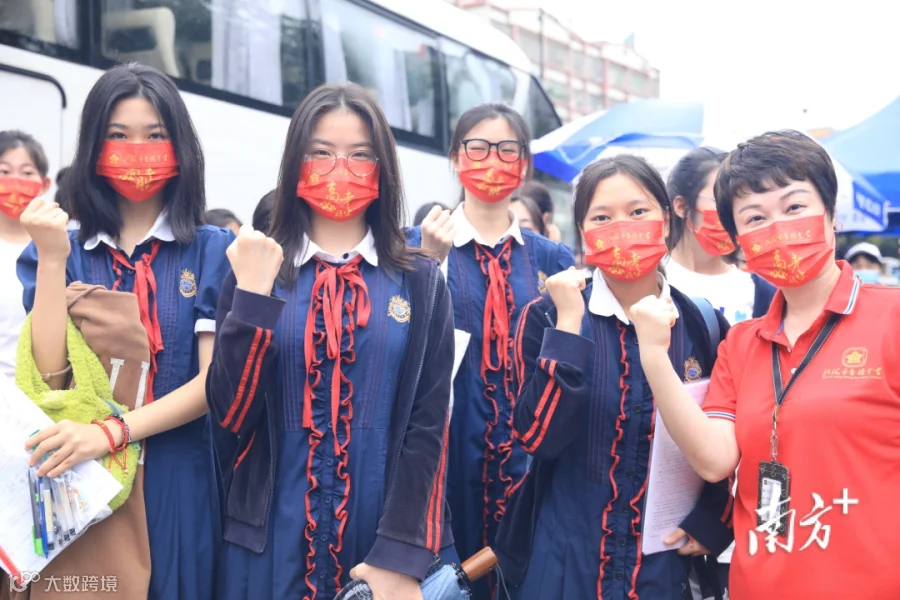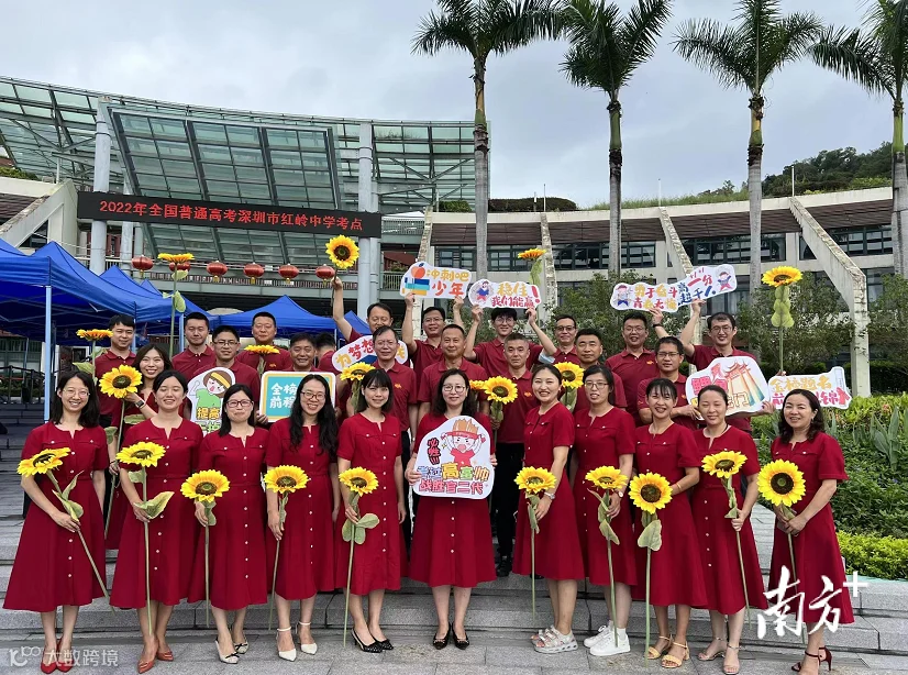 在深圳市福田区红岭中学,老师们统一着红色套裙,手执向日葵,家长们拉起横幅,举着“鲤鱼跳龙门”“稳住,一定能行”等的卡通手牌,组成家长助威团,共同为考生加油。