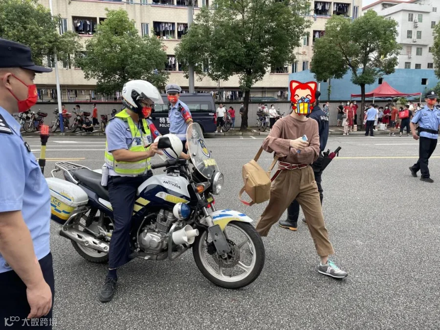 汕头华侨中学考场外,一名考生要拦车前往二中考点未果,向在场护航的民警求助。接到求助信息后,汕头交警铁骑立即伸出援手。