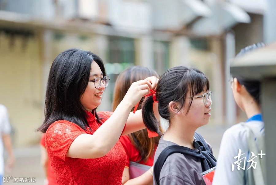 惠州市综合高级中学为考生挂出励志对联,鼓励考生轻装应考。老师为考生扎上红头绳,寓意“鸿运当头”。