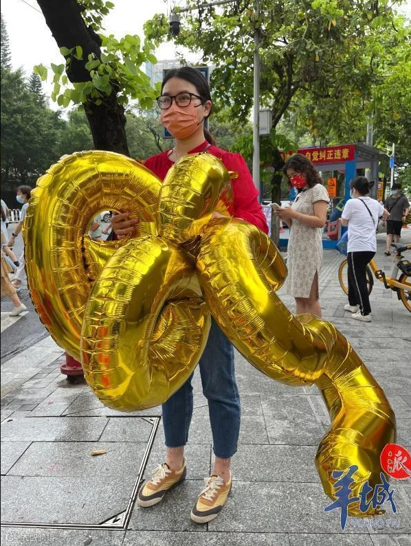 执信中学考生周同学的姐姐,带上气球“985”来助阵。