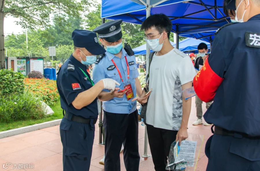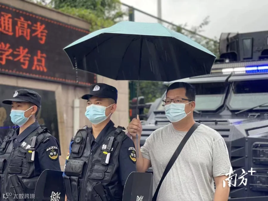 广东实验中学外,几名考生因手机网络延迟、焦急地在校门外等待行程码刷新。广州荔湾民警协助查询信息、帮助考生快速赶往考场。
