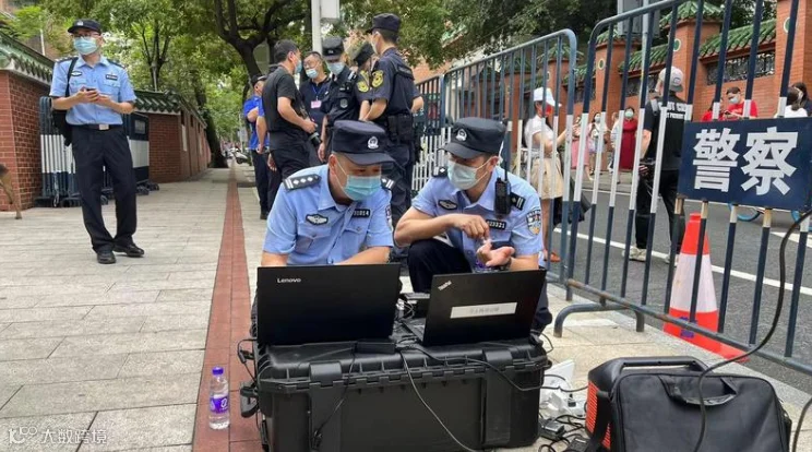 广州市第七中学考点外,越秀警方使用无人机探测反制系统,及时发现考场周边的“黑飞无人机”,保障考场安全。