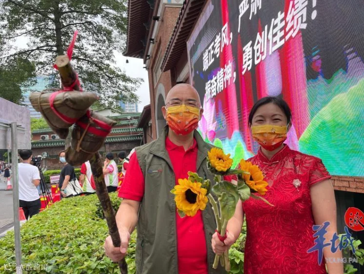 执信中学考生的爸爸黄先生和妈妈一早来到考场门口送考。手中带着粽子和向日葵。他们说:“这是寓意‘一举夺魁,高中状元’!”