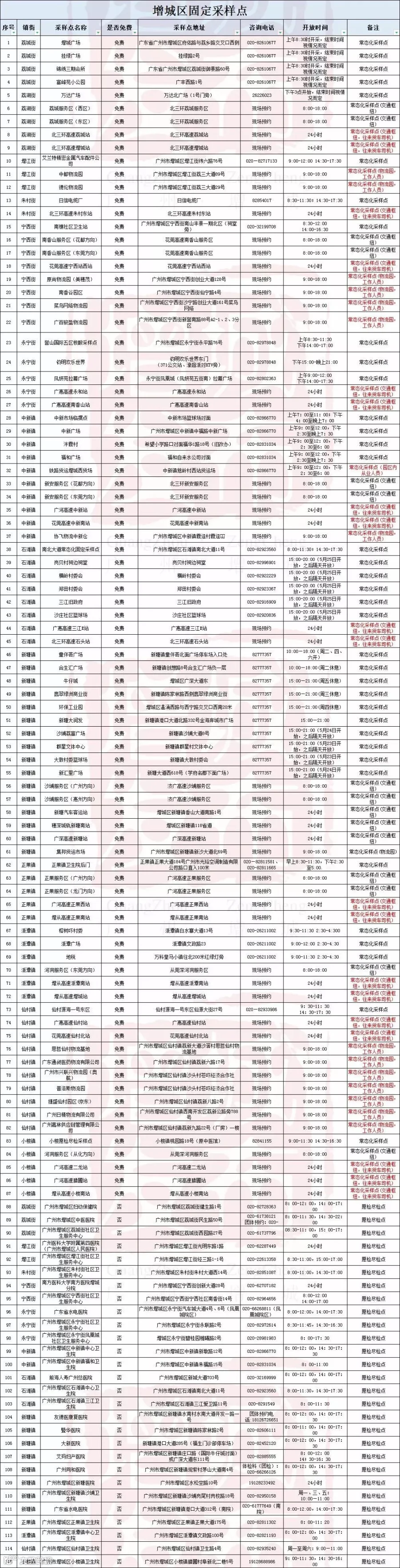 据“广州增城发布”微信公众号消息,增城区“15分钟核酸检测圈”,共设置115个固定采样点,其中87个提供免费采样服务。