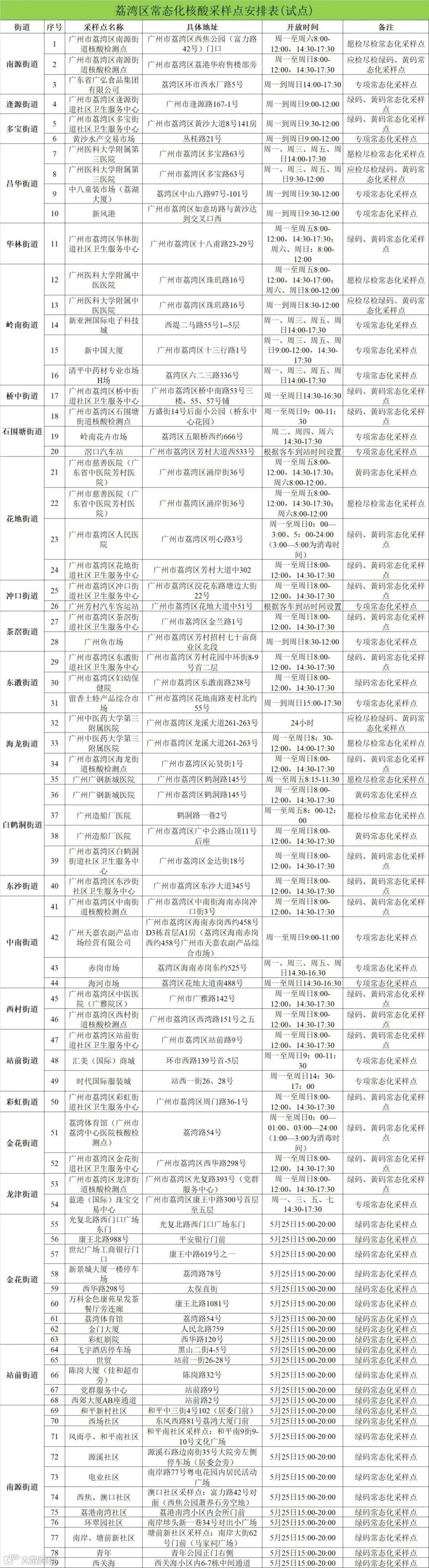 荔湾区常态化核酸采样点 79个试点信息如下:
