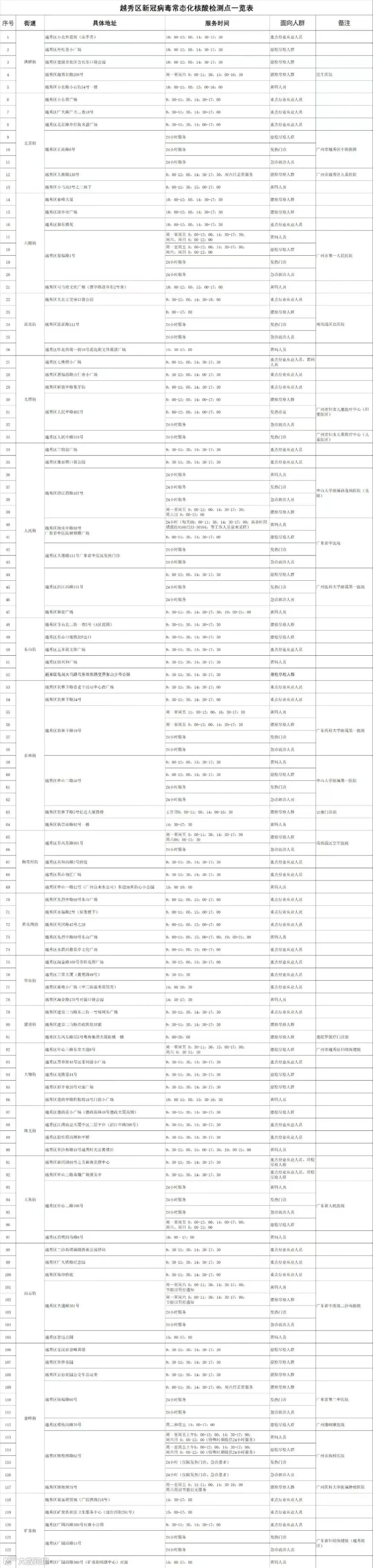 越秀123个常态化核酸采样点:
