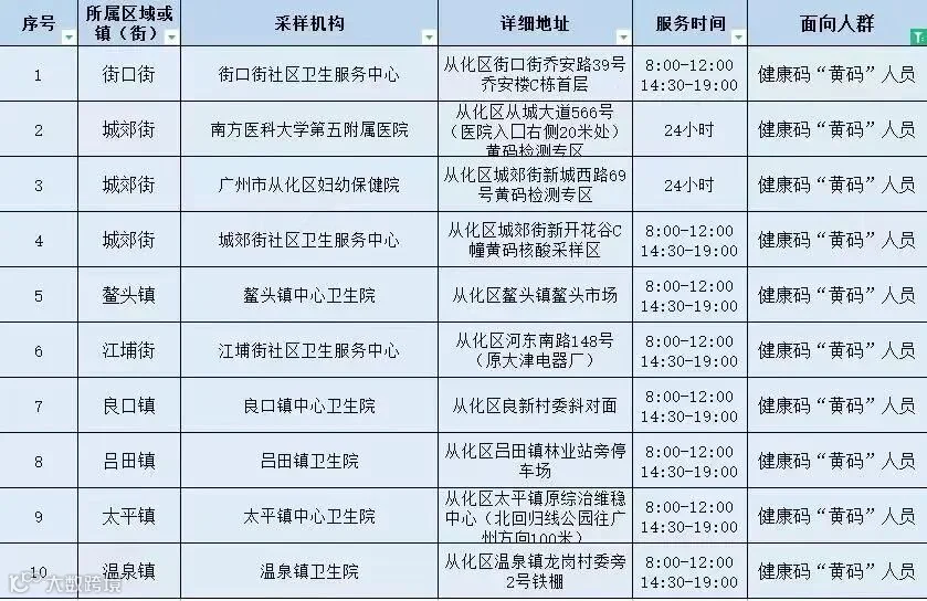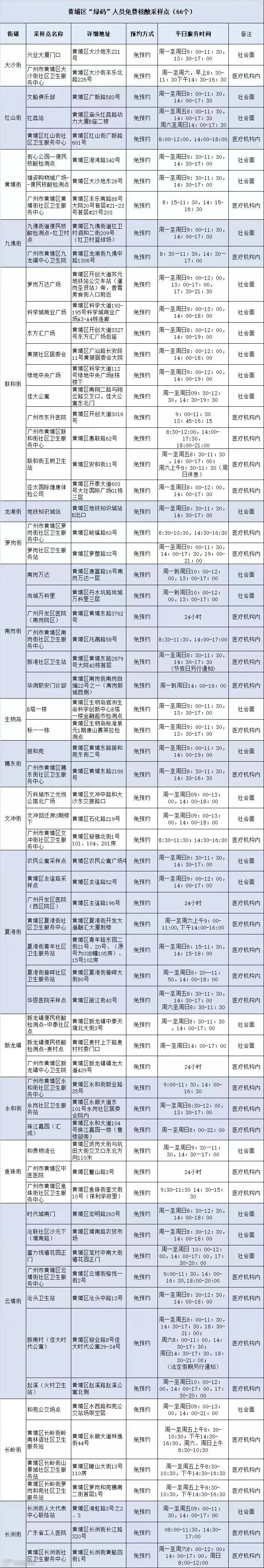 黄埔区 “绿码”人员免费核酸采样点 :