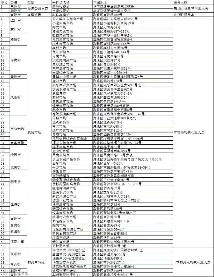 海珠区特定人群核酸采样点信息表: