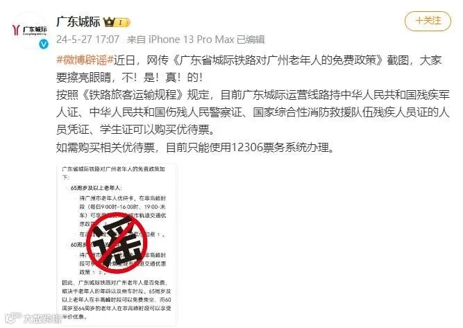 “不!是!真!的!”5月27日,@广东城际 进行了公开辟谣,把谣传的老人优惠票价截图打上醒目的“谣”字,希望大家要擦亮眼睛。