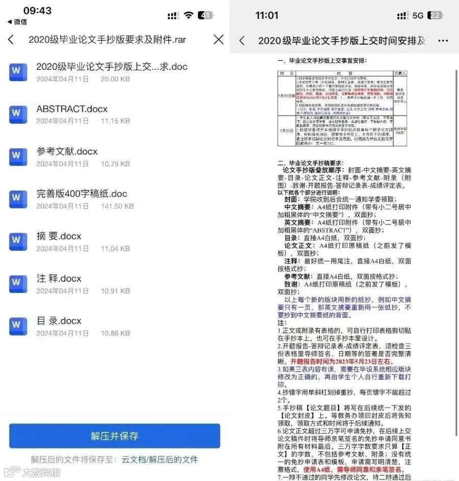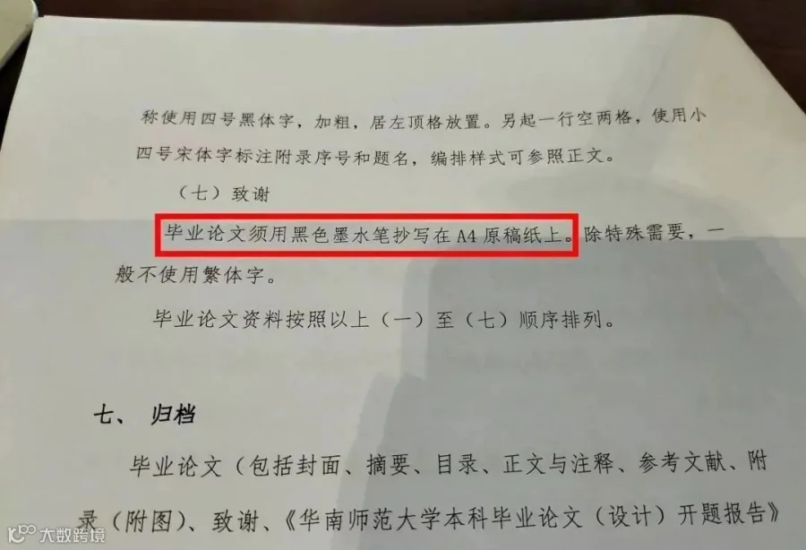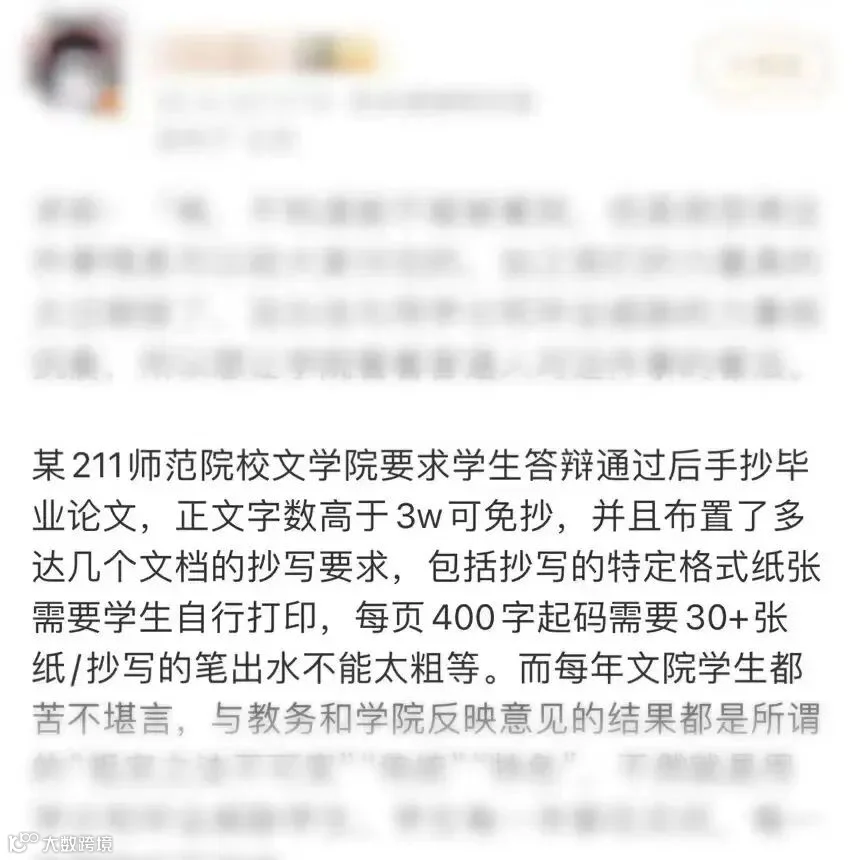 网帖内容称,该学院布置的多达几个文档的毕业论文抄写要求包括,抄写的特定格式,纸张需要学生自行打印,每页400字,起码需要30+张纸,抄写的笔出水不能太粗等。记者注意到,多名网友曾在社交平台发帖称,自己也遇到了学校要求手抄毕业论文的情况。