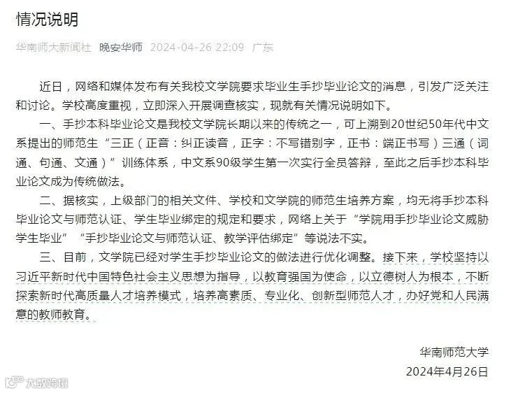 4月26日晚,针对这一社会关切事件,华南师范大学发布情况说明表示,手抄本科毕业论文是该校文学院长期以来的传统,网传“学院用手抄毕业论文威胁学生毕业”等内容不实,已经对学生手抄毕业论文的做法进行优化调整。