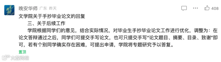 二、据核实,上级部门的相关文件、学校和文学院的师范生培养方案,均无将手抄本科毕业论文与师范认证、学生毕业绑定的规定和要求,网络上关于“学院用手抄毕业论文威胁学生毕业”“手抄毕业论文与师范认证、教学评估绑定”等说法不实。