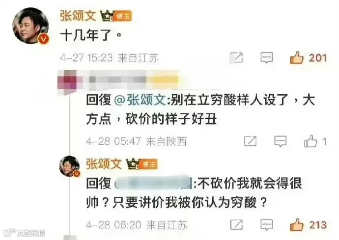 面对这样的批评,张颂文于4月28日通过评论回应,表达了自己的看法:“不砍价我就会很帅?只要讲价我就被认为穷酸?”