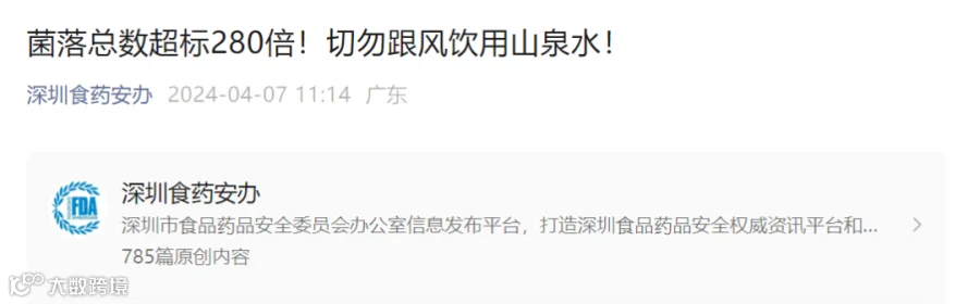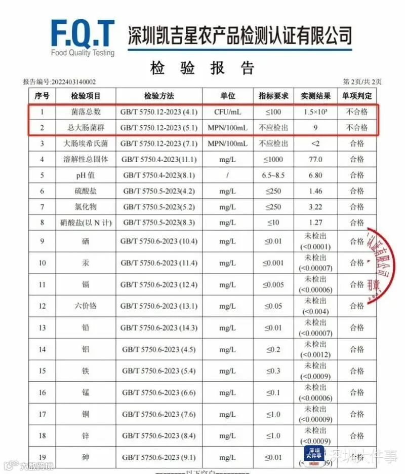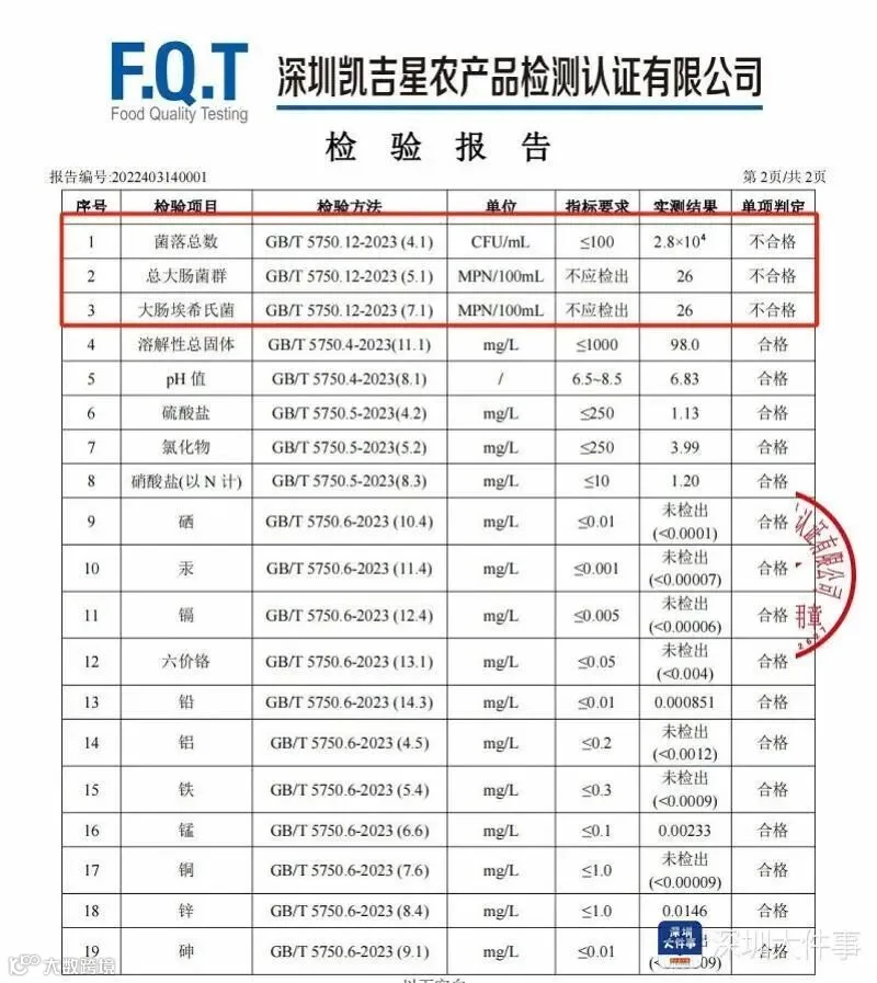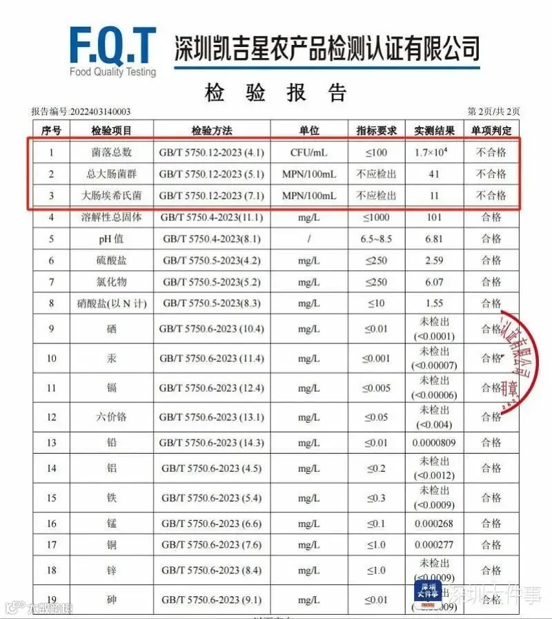 对此,深圳凯吉星农产品检测认证有限公司技术中心总监姜学涯表示,很多市民觉得水质清澈透明可食用 ,其实大多数微生物是看不到的。菌落总数超标,表明水体被微生物污染。以鸡公山②号取水点为例,采样送检报告显示超了正常指标的280倍,存在大肠菌群,说明表征水体被人和动物粪便污染,存在大肠埃希氏菌则容易引起腹痛、呕吐、发热。