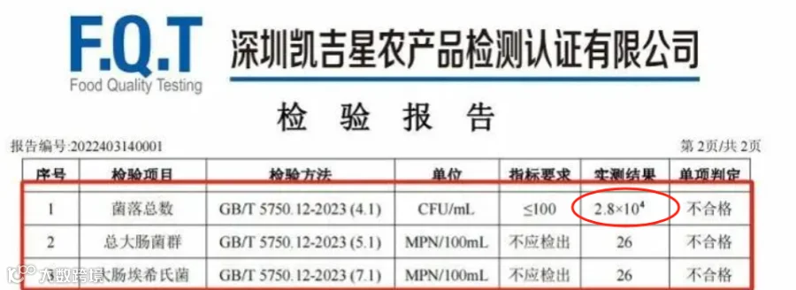 采样送检的报告显示:菌落总数超标,检测出总大肠菌群,判定结果不合格。