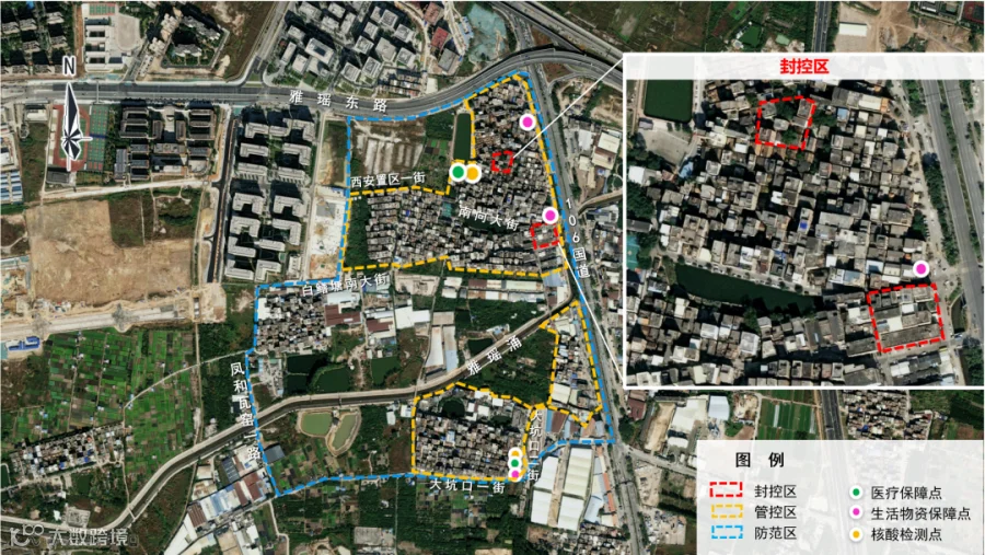 防范区:雅瑶东路(空铁大道)以南、大坑口一街以北、凤和瓦窑一路以东、106国道以西区域(封控区、管控区除外)。