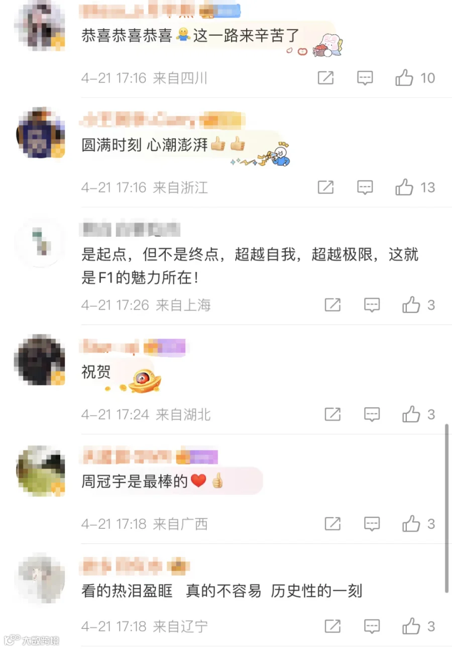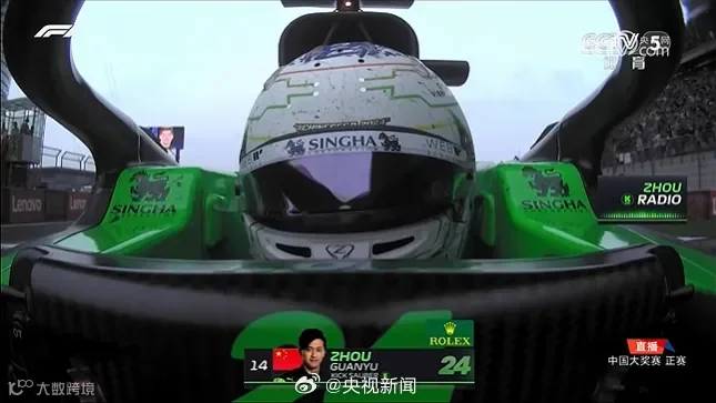 4月21日 2024世界一级方程式锦标赛 中国大奖赛正赛 在上海国际赛车场举行 最终 红牛车队车手维斯塔潘获得冠军 迈凯伦车队车手诺里斯 和红牛车队车手佩雷兹 分获亚军和季军 索伯车队中国车手周冠宇从第16位起跑最终排名第14,成为F1历史第一位在中国站完赛的中国车手。赛后,周冠宇感谢了在现场和屏幕前的所有车迷。在全场的欢呼声中,他掩面而泣。 首次主场作战的中国车手周冠宇在赛后接受了媒体采访。周冠宇说:“这10年总共哭过两次,第一次是经纪人给我打电话,告诉我签约成了F1车手,是2021年。 “第二次就是今天在上赛完赛的回场圈,想着自己20年这些经历,想着这些大家在电视机前看不到的背后的一些困境困难需要去面对,自己也无法想象有一天有一位中国车手,站在属于我们中国的这片赛场,想着这些就很激动,同时也很享受这个周末。 ——如果用一个词来概括今天的比赛会是什么? 周冠宇说:“终生难忘!” 世界一级方程式锦标赛和奥运会、世界杯并称全球三大赛事,目前在这条赛道上,中国选手只有周冠宇一个人。首次主场作战,他的头盔上印着上海地铁线路图和多个上海地标建筑。 赛前,他说在家乡作战对他意义非凡,“从20年前的小车迷,到如今的F1车手,希望车迷们可以看到,中国车手在国际赛车场飞驰!” 4月21日,周冠宇在2024格子旗嘉年华音乐会上回应为何自己有很多不一样的头盔,是想用赛车头盔推广上海以及中国的一些文化,而那个印着上海地铁路线图的头盔承载了他在上海的整个回忆和经历。 “我想让大家知道这位中国车手 从低级别赛事一路走上来” 2004年,F1首次走进中国,那时5岁的周冠宇第一次坐进中国上海国际赛车场的看台,赛场上震耳欲聋的引擎声,让当时的他还有些害怕和紧张。但从那时起,他就对F1深深着迷。 从8岁开始接触卡丁车,周冠宇几乎拿遍了国内各个赛事的冠军。但是出国后,他才发现自己连跻身世界前十都很难,这对当时的他来说打击很大。 周冠宇回忆,职业生涯第一次在国外夺冠时,都没有中国国旗和国歌,他们不知道中国车手还可以站在这个平台的最高点。 后来他一次次的突破,也慢慢地让世界知道有这么一位中国车手,从低级别赛事一路走上来。 周冠宇说很多人喜欢叫他“Chinese Zhou”(中国周),尽管现在越来多的人认识他,也知道了他的全名,但是“中国周”一直是伴随着他的标签。“我觉得一位中国车手踏入F1的赛场是一件很不容易的事情,很开心可以告诉大家我来自哪里。”