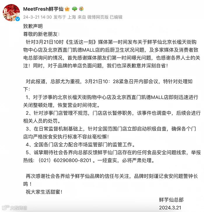 鲜芋仙总部3月21日上午10时紧急召开内部会议,对于涉事的北京长楹天街购物中心店及北京西直门凯德MALL店立即进行关闭整顿处理,恢复营业时间待定。针对涉事门店管理不规范,门店店长暂停职务,该事件也在调查中,后续会进行相关人员的处罚。