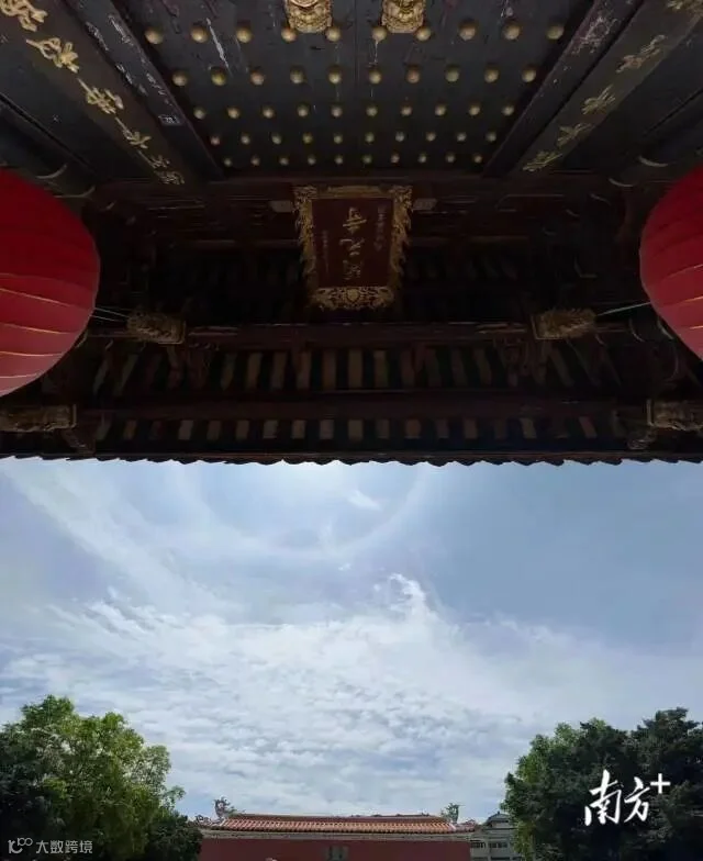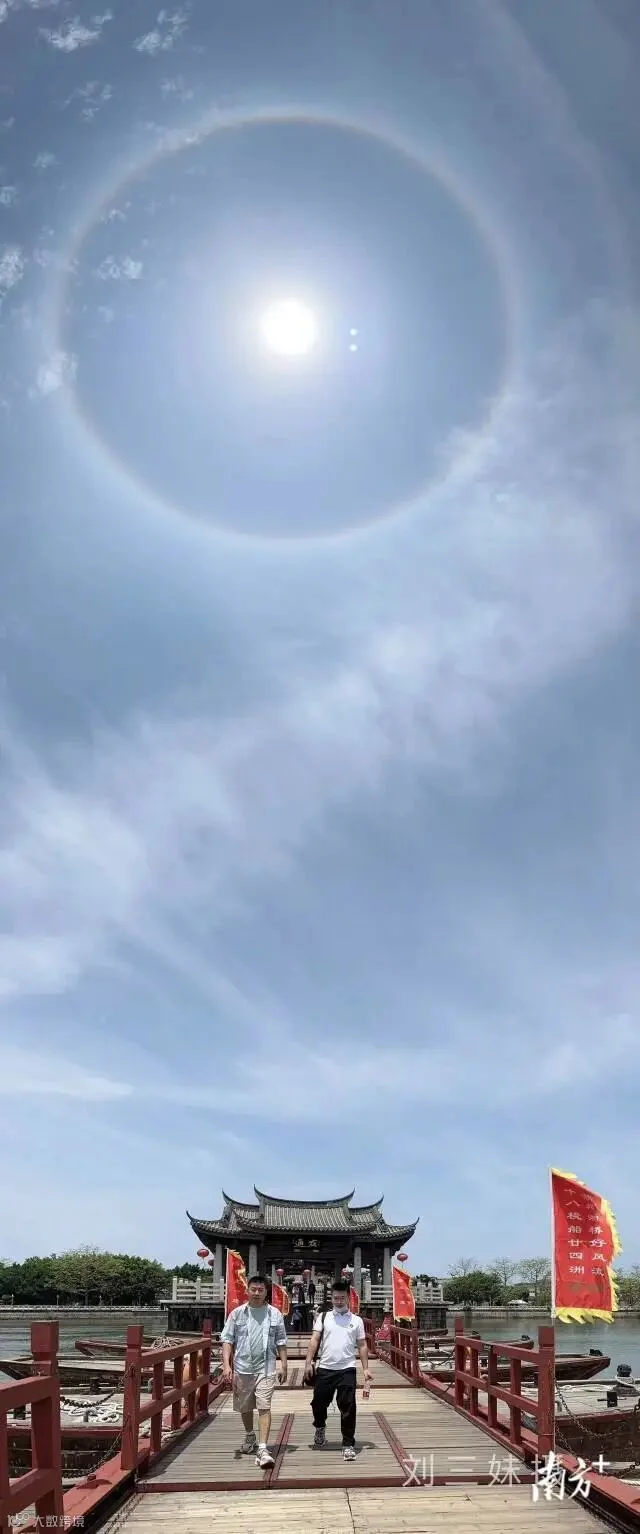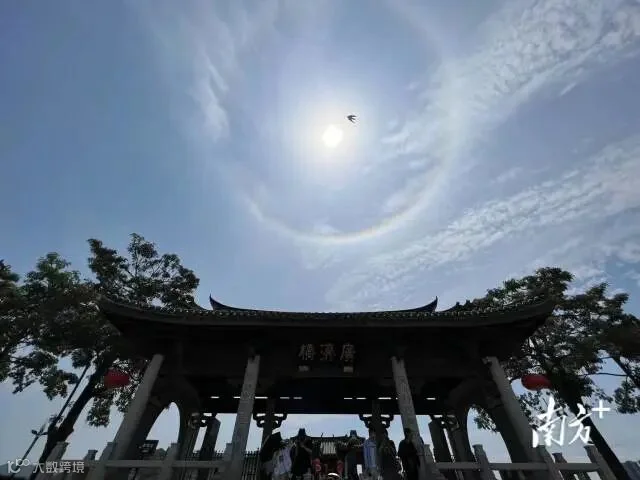 在潮州广济桥太阳周围可见一圈漂亮的彩色光环,像被圆形彩虹拥抱着,日晕与广济桥交相呼应。此景象持续了半个多小时,图片影像在朋友圈引发关注。