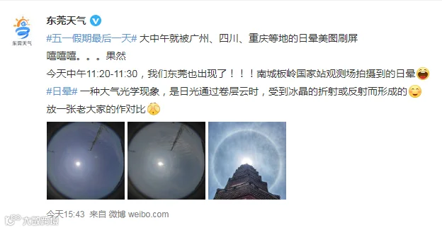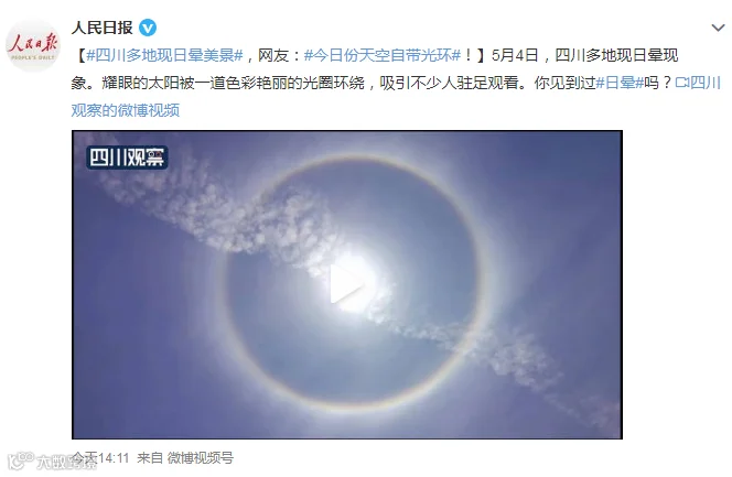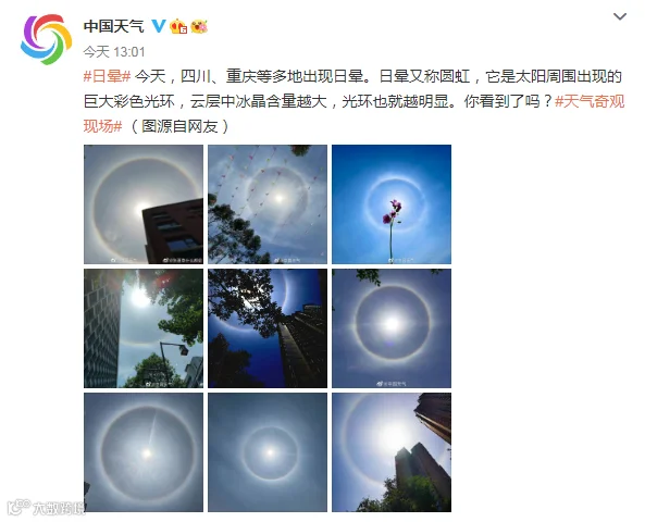 据介绍,4日出现的日晕又称圆虹,是太阳周围出现的巨大的彩色光环。据了解,有时还会出现双层日晕,这是因为冰晶的位置关系折射了两次而形成的日晕。一般来说,云层中冰晶含量越大,光环也就越显著。