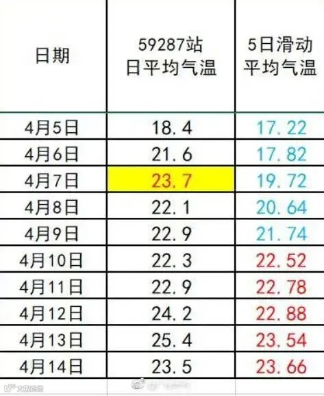 以广州为例,从4月10日开始,5日滑动平均气温为22.52℃,一直到4月14日的5日滑动平均气温为23.66℃,均达到≥22℃的标准。而最早超过22℃的是4月7日的23.7℃,因此4月7日被定位入夏。