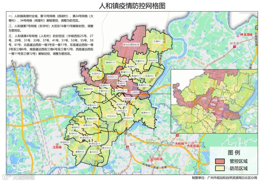 二、人和镇高增村全域、第10号网格(鸦湖村)、第24号网格(大巷村)、34号网格(明星村)解除管控,调整为防范区。