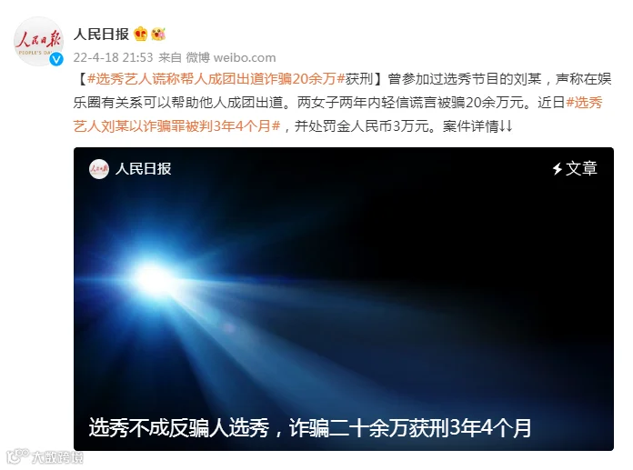 选秀艺人刘某以诈骗罪被判3年4个月,