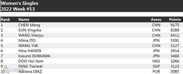 女单方面,陈梦依旧排名第一