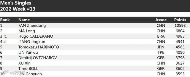 在国际乒联第13周排名中,樊振东以10598分高居男单第一,领先第二名马龙3000多分。巴西选手卡尔德拉诺重返第三,梁靖崑下降到第四位。