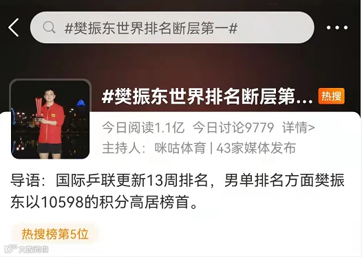 樊振东以巨大优势“断层”第一