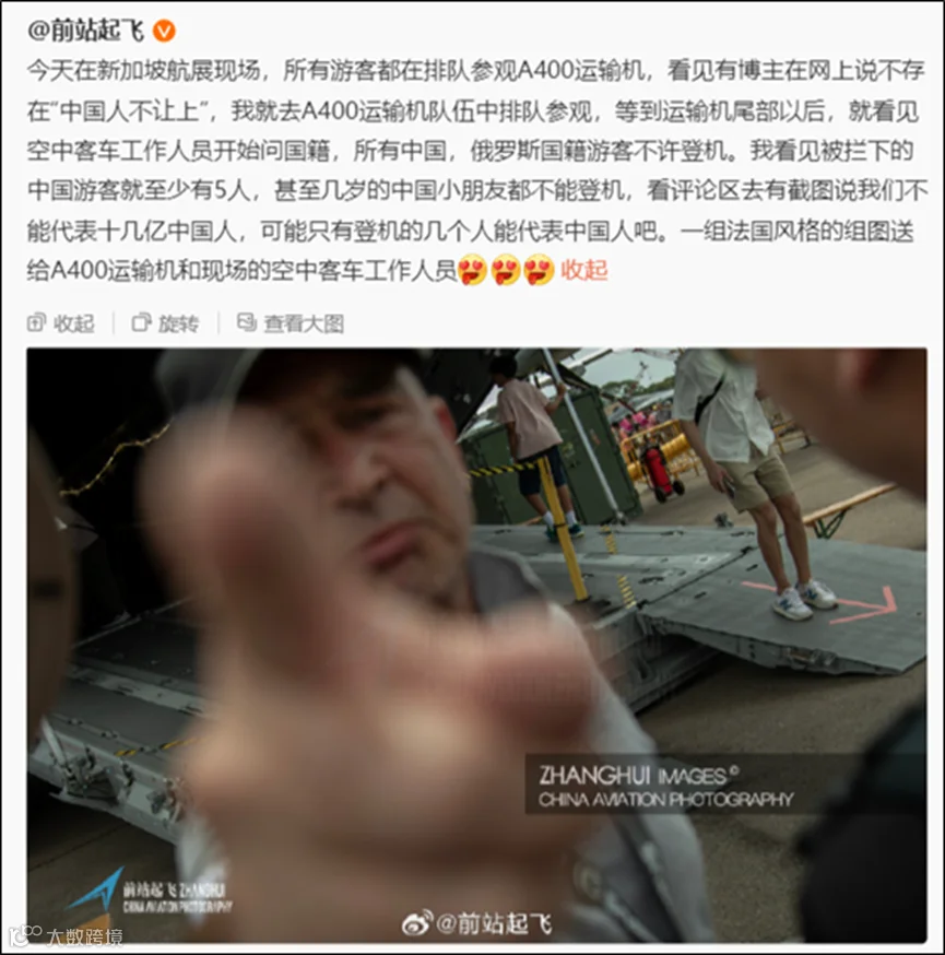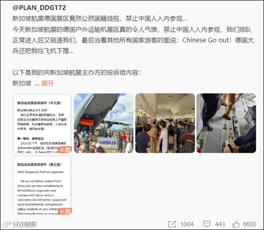 此前,据多名中国网友2月24日反映,一架隶属德国空军的A400M运输机在参加新加坡航展期间,该飞机的工作人员以粗暴的态度拒绝中国籍游客登机参观。