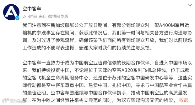 空中客车公司方面表示,已注意到在新加坡航展公众开放日期间,有部分到场观众对一架A400M军用运输机的参观事宜存在疑问。
