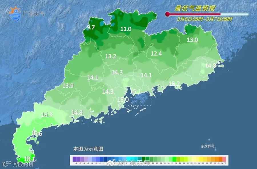 6到7日,广东省大部阴天,有分散小雨。最低气温:粤北市县11℃~13℃,南部市县16℃~20℃,其余市县13℃~16℃。